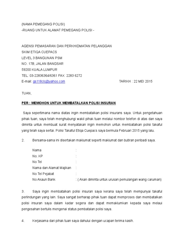 contoh surat pembatalan insurans dalam bahasa melayu